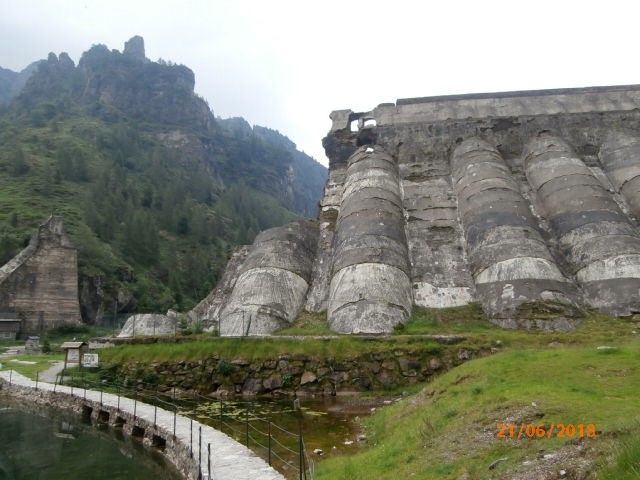 I ruderi della diga si vedono presto: sono più grandi di come li immaginassi. Dello sbarramento, di come fu per poco, restano un tratto sulla destra orografica, che sarà circa un terzo dell'insieme, e uno sperone dalla parte opposta. Il placido, limpido, lago di adesso è trattenuto da una bassa barriera di cemento che si attraversa mediante una passerella stabile. C'è un monumento, nel tratto lasciato vuoto dal crollo, che porta una targa con la data di quello. Dirimpetto una bella bacheca mostra fotografie storiche che riguardano le opere della diga. Oltre, alzandosi di poco seguendo un solco nel prato, si giunge a una baracca di legno che ospita un bar. Da lì, insieme al mio compagno di escursione, con una lattina di birra in mano, contemplo un notevole monumento all'insipienza, cioè alla totale mancanza di responsabilità intellettuale e morale, degli umani. Di taluni, almeno, quelli che comandano.