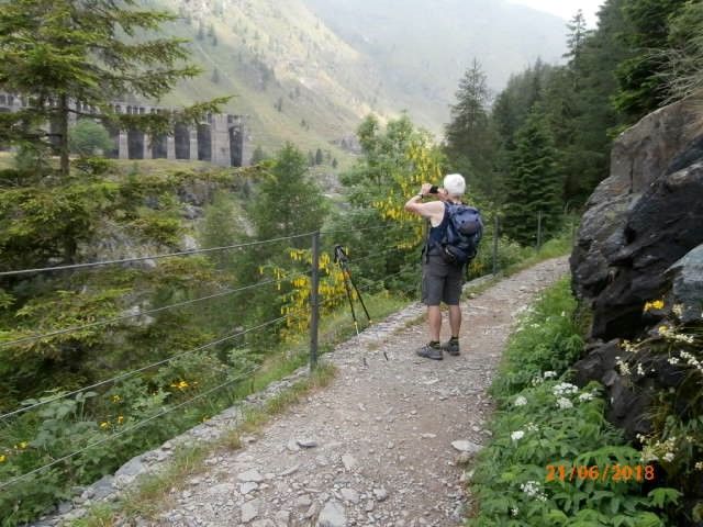 Quando si infila nel bosco, lo stesso sentiero, largo, un poco sassoso, molto frequentato, aumenta di parecchio la pendenza. Sicché o si rallenta il passo o, se lo si vuole mantenere rapido come nel tratto precedente, si fa una sudata da sgocciolare come è successo a noi. La giornata è calda e umida, la Presolana e il pizzo Petto hanno la vetta circondata da vapori. Scavalcata una condotta forzata si giunge, con pochi passi, al manufatto di cemento dal quale il grosso tubo ha origine. Ora siamo a quota 1.503. Da qui il percorso è praticamente tutto perfettamente in piano. Andiamo per un viottolo, a tratti scavato, a tratti costruito, che taglia la parete che forma, insieme a quella di fronte, una gola che si restringe man mano. Il bordo è tutto protetto da ringhiere di fili metallici pressoché continue.