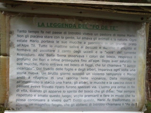 Qui il sentiero è ripido e contorto, stretto e rotto, traversa tratti di frana e pendii irti di sassi e di cespugli radi. Poi si attenua, restando minuscolo anche se ben marcato, si insinua tra faggi che non lasciano crescere altri che sé stessi. Ancora non ci siamo ma manca poco, ci informano gli ardimentosi che risalgono il vallone. L'Alpe è uno slargo evidente dove la pendenza è di molto attenuata. Ma è ingombra di erbe alte e felci che sono tossiche per le mucche oltre che per gli umani. Quando ci passai, quattro anni fa, c'era ancora un prato buono per il pascolo. I faggi, qui, sono davvero grandi. Il maggiore spicca magnifico al bordo della radura. Oltre, il terreno scende a precipizio. Solo a cercarla si nota una traccia zigzagante sullo spesso cuscino di foglie alla base della faggeta: faticosissima da risalire, pericolosa da scendere. Ci divertiamo a scattare fotografie da tutte le posizioni, a noi e all'albero. Poi qualcuno di noi si accorge che alla base del gran tronco c'è una specie di targa, un cartello neanche tanto grande, dove è raccontata la storia di Mario che preferiva la montagna, il pascolo, il bosco, le mucche e gli altri animali alla gente di Introbio, il suo paese. Quando una frana lo travolse gli apparve lo spirito del bosco che, per evitare che morisse, lo trasformò in un albero, un faggio, per consentirgli di vivere nei luoghi che aveva sempre rispettato e amato.
