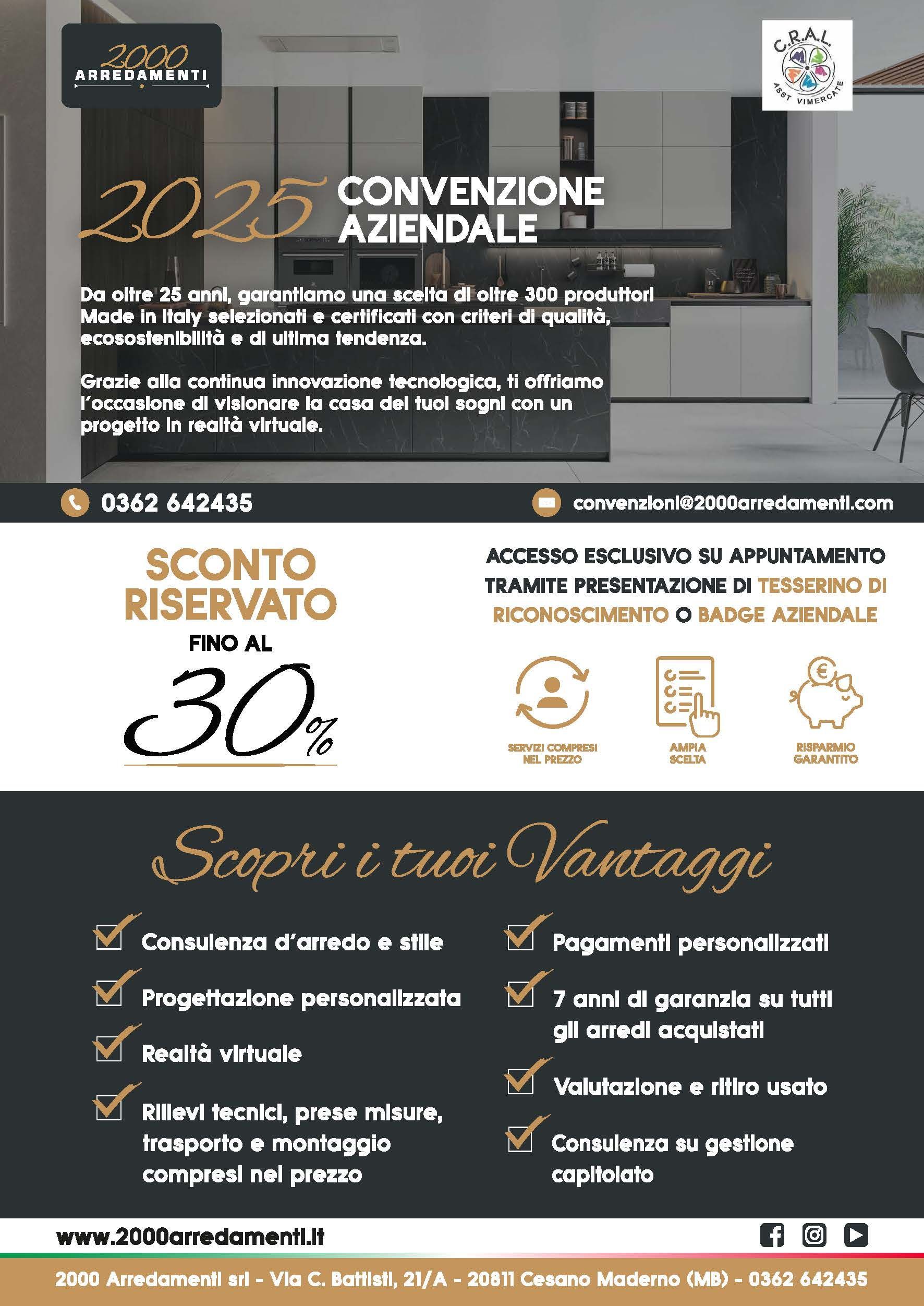 | Ma ora veniamo a voi. Molti membri di personali convenzionati con 2000 Arredamenti hanno ottenuto un risparmio fino al 40% grazie alle promozioni riservate. Non è solo una questione di prezzo: chi si affida a noi scopre la qualità, la competenza e l'attenzione che da sempre ci contraddistinguono. Il passaparola tra colleghi ha già portato numerose persone a fare acquisti consapevoli e vantaggiosi. E i risultati parlano chiaro: clienti soddisfatti, a mbienti rinnovati e investimenti intelligenti. Se anche voi fate parte del personale convenzionato con 2000 Arredamenti, approfittate dei vantaggi esclusivi che vi spettano e richiedete un appuntamento presso il nostro showroom. |