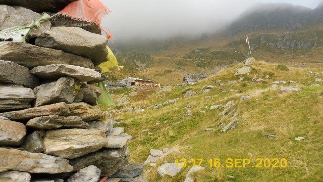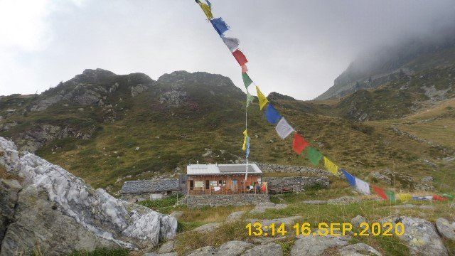 Siamo arrivati sù, al rifugio Balicco, alle 11:40 rispettando quasi alla perfezione il tempo, un'ora e trenta, indicato dal cartello all'inizio del sentiero. Infatti avevamo lasciato l'auto al tornante numero nove della provinciale che da Mezzoldo porta al passo san Marco, alle 10:05. E' ben segnalato e molto ben curato questo percorso che inizia con un bel tratto ondulato tra abeti e prati. Si devono attraversare anche quattro sparuti ruscelli, senza difficoltà alcuna. Poi inizia una salita zigo zago che porta sù di quota. Si incontrano diversi alpeggi dei quali alcuni sono ben tenuti. Una targa per ciascuno indica il nome e la quota. Del rifugio Balicco si vede la bandiera, che indica che è aperto, solo quando si è vicinissimi. Questo, per chi non c'è mai stato, impedisce di valutare quanto manca alla meta quando, considerando il tempo dedicato, in teoria, si dovrebbe essere già là. Vi sono, in prossimità del rifugio vero e proprio, a marcarne la singolarità, due alti coni, costruiti coi sassi, sui quali poggiano diverse file di bandiere nepalesi che fanno un bell'effetto.