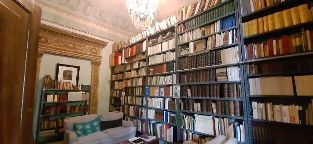 La stanza attigua a quella dove sono collocati i divani, ha le pareti ricoperte da libri. Sono soltanto una parte di quelli che si trovano qui a Trezzo. E' un peccato che non ce li abbia fatti vedere nel loro insieme.