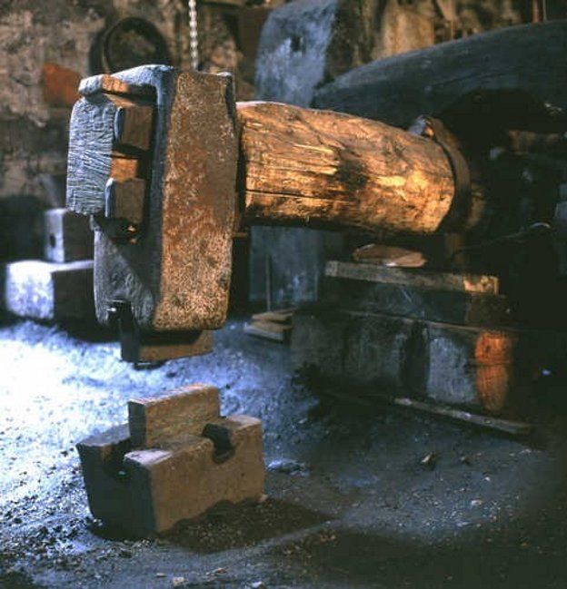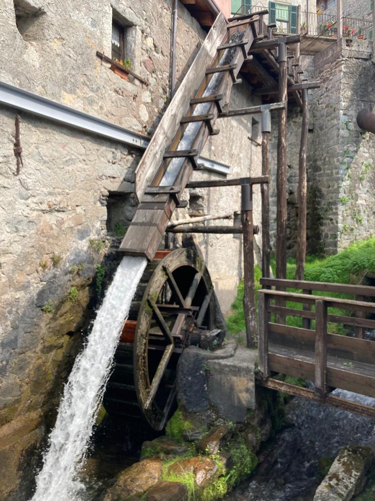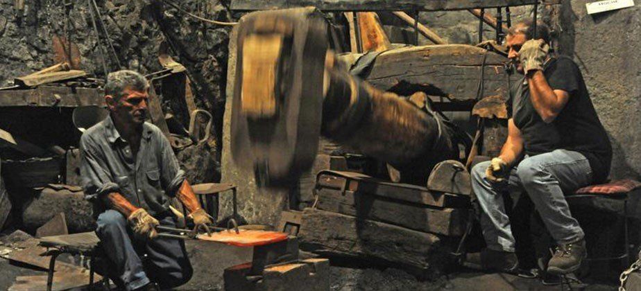 L'indicazione di un punto di ristoro ci convince a salire sulla collina del Cristo Re. Ma troviamo un parco piuttosto squallido, il paesaggio nella foschia e nulla da mangiare. Torniamo a Bienno dove ci fermiamo presso il ristorante "Vecchio mulino". Lì vi sono dei tavoli adeguatamente distanziati ben disposti sul terrazzo; non ci sono rumori artificiali a recare disturbo alla conversazione; il servizio è ottimo e i casoncelli alla camuna, come le altre vivande che assaggiamo del resto, sono proprio buoni. Spendiamo, in tre, € 62,00. Stavolta presso il Museo etnografico del ferro ci sono almeno trenta persone che aspettano di vedere la dimostrazione a fuoco. Oltre a Davis, che abbiamo conosciuto la mattina, quattro uomini, non più giovani ma con il piglio deciso che si conviene dovendo manovrare macchinari arcaici e tuttavia potenti, sono impegnati in non so che intervento presso la grande ruota che è fissata al muro esterno all'officina. Sono attrezzati con pesanti mazze, cunei di legno da mezzo metro, un secchio di lubrificante solido. Dal canale Vaso Re, che corre all'altezza della gronda del tetto, fin che non avranno terminato il lavoro, non verrà cavata acqua. Quando, concluso il loro trafficare, viene aperta la saracinesca la rotazione della rotante è velocissima. Un albero enorme, costituito da un fascio di tronchi tra loro serrati, trasmette il movimento alle macchine all'interno. Tutti questi uomini devono avere lavorato lì (o in quel settore lì) negli anni addietro, quando quelle officine erano attive e producevano manufatti e ricchezza. Ho questa impressione perché trovo che si muovano sicuri. Vediamo prelevare dal forno una barra di ferro incandescente e sorreggerla con pinze dal manico lungo come ne abbiamo viste esposte nelle strade del paese. Adesso occorre muoverla sotto i colpi rapidi e possenti del maglio. Uno degli addetti si siede al posto che un tempo era quello dell'apprendista a fare assistenza all'operatore specializzato. Un altro è incaricato di reggere la sicura ovvero la barra che ferma immediatamente, tirandola, il movimento del gran martello. Chi regge il ferro da lavorare lo muove coordinandosi col movimento alternato del maglio. Trema il pavimento, vibrano i muri. E' un lavoro pesante e pericoloso: è facile scottarsi, bruciarsi, rompersi le ossa. Diventare sordi, dopo un poco, è certo. Questa cui assistiamo è solo una dimostrazione ma c'è stato chi l'ha fatto, questo lavoro, per dieci ore al giorno, per tutta la vita.