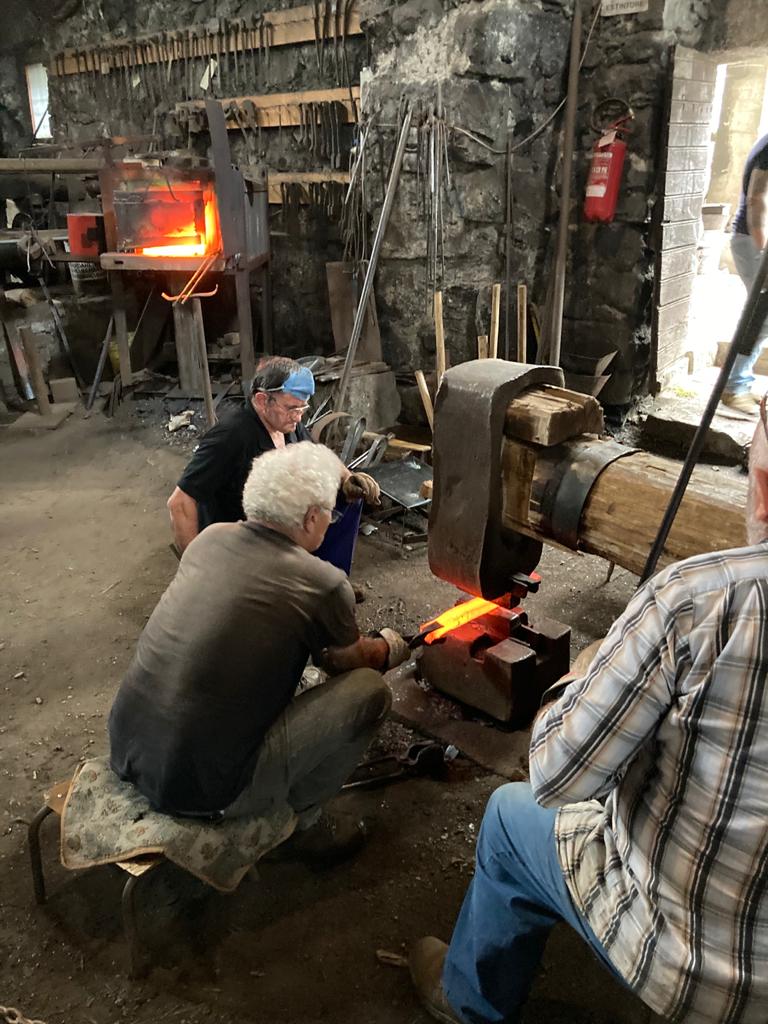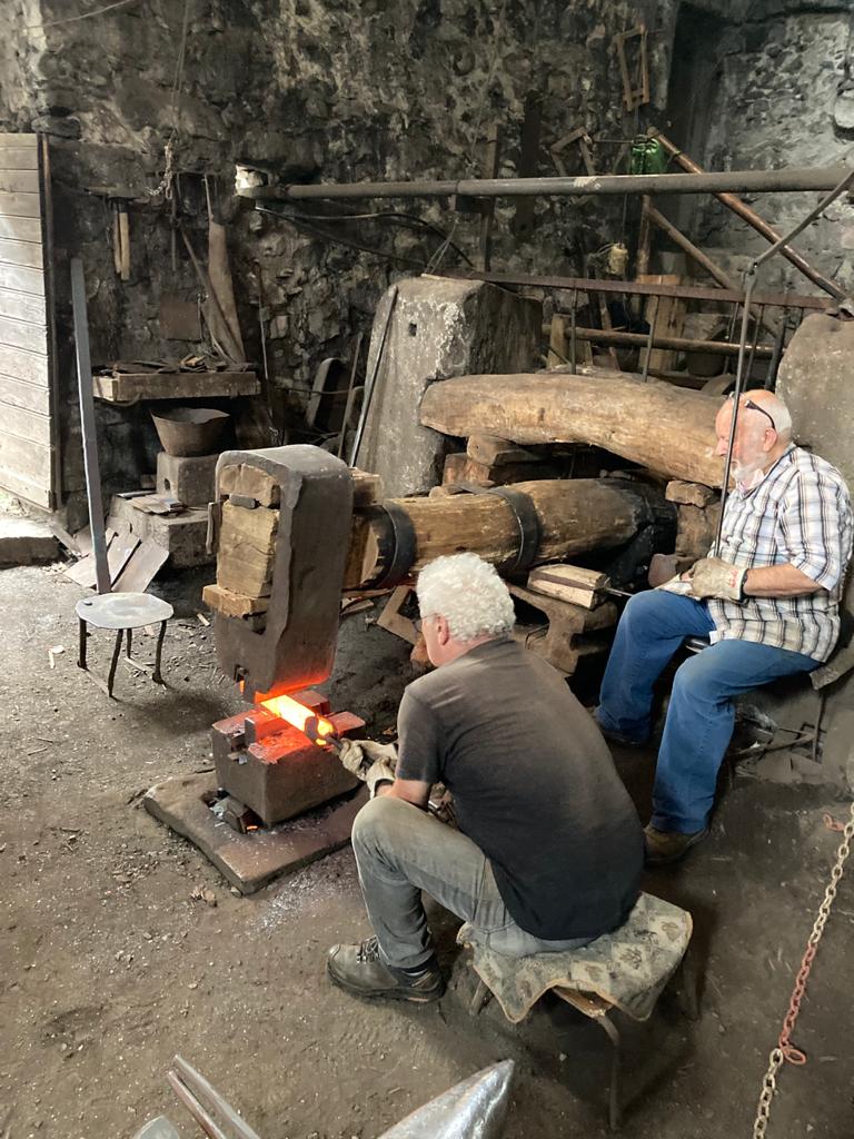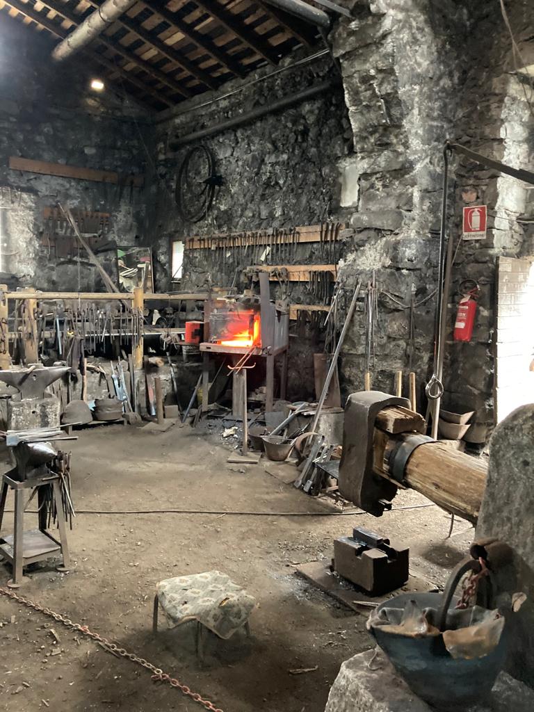 E' stato verso le sedici che siamo tornati alla fucina che è presso il Museo etnografico del ferro in via degli Artigiani a Bienno. In tarda mattinata quando eravamo già stati lì, non vi era nessun altro visitatore e il signor Davis, artista, fabbro, storico, filosofo, custode del Museo s'è dovuto distogliere da ciò che lo stava impegnando per dare retta a noi. Il solo ingresso costa due euro ma con l'aggiunta di un altro euro si ha diritto alla visita guidata dallo stesso Davis. Ci muoviamo dentro due ambienti piuttosto ampi, con poca luce che entra dalle aperture troppo piccole. Non vi è un pavimento piano poiché il fondo è fatto di terra battuta piuttosto sconnessa. Fate attenzione, dice Davis. Infatti vi sono, in quantità, oggetti di ferro dalla foggia più varia, ammucchiati, appoggiati o appesi quasi dovunque. Vi è, tuttavia, uno spazio riservato agli ospiti, contornato da una fettuccia, dove muoversi agevolmente. C'è, tra gli innumerevoli equipaggiamenti, un forno alimentato a legna, ora non più in uso ma ancora funzionante, che toccava ai bambini far partire la mattina presto. Quello che viene utilizzato attualmente nelle dimostrazioni del lavoro della fucina, utilizza il gas. Il maglio è il macchinario più grande tra quelli presenti nell'officina. E' una sorta di enorme martello, dal manico di legno e la testa di ferro come dev'essere. A muovere tutto è l'energia dell'acqua che scorre nel Vaso Re un canale artificiale la cui prima impronta è dovuta ai monaci Benedettini che nel l'Ottavo secolo deviarono parte del flusso del fiume Grigna. Segherie, lavatoi, coltivi, mulini e fucine poste nei comuni della vallata toccati dal canale, ne hanno tratto profitto per secoli. L'edificio nel quale ci muoviamo risale almeno all'anno 1.400 La lavorazione del ferro in questa zona veniva effettuata già nell'antichità data la coincidenza di tutte le risorse indispensabili per poterlo fare: la forza dell'acqua, il calore della legna, il minerale di ferro. Ovviamente messe in opera dall'ingegno e dal lavoro di chi qui viveva. Nel tempo, le modalità di lavorazione e l'organizzazione sociale che le consentiva sono mutate parecchio. Se si guarda agli anni che precedono le innovazioni apportate dalla rivoluzione industriale, tecnologica e capitalista, della seconda metà dell'Ottocento, il periodo di maggiore vigore delle attività basate sul ferro, fu quello del dominio di Venezia. Qui l'attività estrattiva, il trattamento e il trasporto dei minerali, la regolazione delle acque, la conduzione dei boschi e il lavoro nelle fucine vennero ordinate in un sistema coerente ed efficiente. Non per nulla. Il nostro interlocutore ci mostra un disco di metallo piuttosto sottile dai bordi un poco sfrangiati. Quello è sia il risultato di molte manipolazioni che la base di partenza per altre. Fuso, battuto e rifuso più volte, tanto che da un blocchetto di ghisa siano state tolte buona parte delle scorie e molto carbonio. Ora è ferro, di buona purezza, e ben malleabile. Da quel disco si potrebbe ricavare una pentola ma anche un elmo o, a sagomarlo bene, anche parti di una corazza. Ci vengono mostrate una punta di lancia e una vanga: la struttura e gran parte della forma sono le stesse, ambedue vanno fissate ad un'asta o a un manico. Ma prima che si affermassero le armi da fuoco, la prima si sarebbe potuta vendere ad un prezzo assai superiore rispetto alla seconda. Tuttavia a un certo punto tante lance non occorrevano più quando la polvere da sparo ha mutato le tipologie degli armamenti. Del resto anche la richiesta di pentole e di secchi si è quasi annullata, negli anni Sessanta del secolo scorso, con l'avvento dei contenitori di plastica. Nei decenni successivi sono sopravvissute solo le fucine che riuscirono a specializzarsi nella produzione di utensili per l'agricoltura. Ora non sono più attive nemmeno quelle. La produzione di carattere industriale, insediata in pianura si è presa tutto.