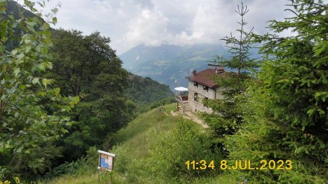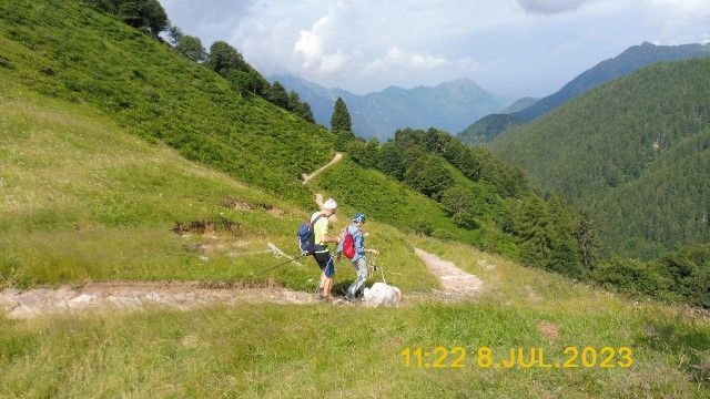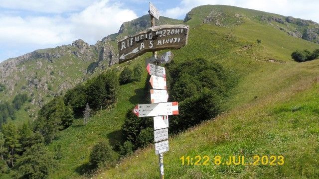 Bastano pochi passi per uscire dal villaggio che fa capo alla stazione della funivia. Attraversato un tratto di prato popolato dalle mucche, si entra in un bosco fitto di giovani faggi. Qui intravvediamo dei caprioli. Alla bocchetta il sentiero prosegue, in bella salita stavolta, per il rifugio Grassi. A destra si vede la Valtorta con il punto di partenza della seggiovia che arriva fin quassù. Svoltando a sinistra si scende, ma solo di poco, fino al rifugio Buzzoni.