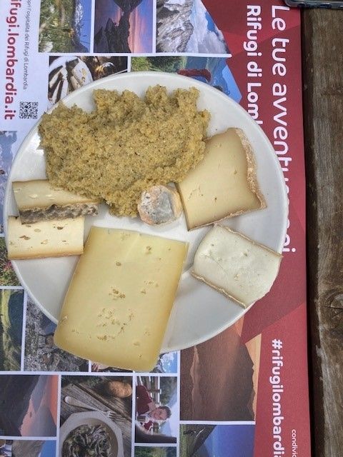 Alle 12 si mangia: ci portano dei piattoni coi pizzoccheri e risotto coi funghi. Poi una porzione di polenta e formaggi che è così abbondante da bastare a tutti noi tre. Tutto buonissimo.