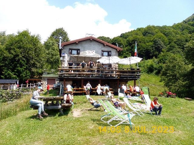 Quando arriviamo al rifugio Buzzoni, poco prima delle 11, non ci sono che poche persone. Sia i tavoli all'interno che quelli sul terazzo sono già tutti dotati di un numero segna posto e di buste contenenti posate e tovagliolo appoggiate su tovagliette di carta, coloratissime, con la reclame dell'associazione dei rifugi di Lombardia. Prenotato il pranzo ci sediamo sulle panchine che sono sul breve tratto di prato lì sotto. A portarci la birra è uno dei ragazzi del rifugio. A quell'ora lo può ancora fare.