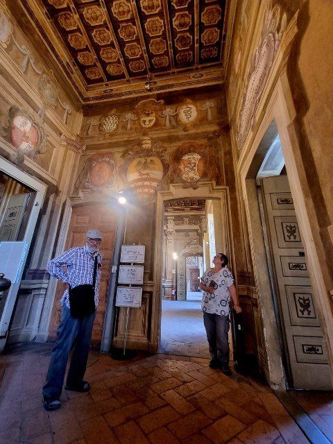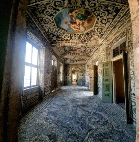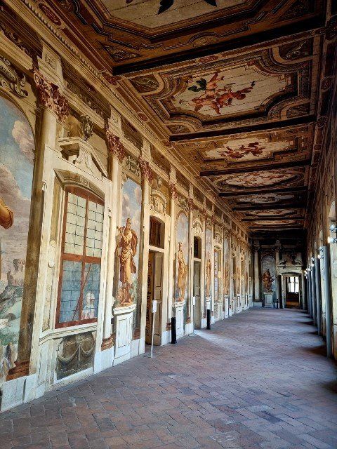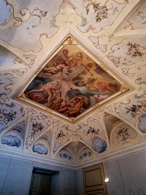 Ci apre una porticina: siamo i primi visitatori di questo pomeriggio domenicale. Le sale, diverse tra loro per altezza e superficie, affrescate in ogni dove fino all'inverosimile, sono vuote. I soggetti delle decorazioni e dei dipinti sono quelli consueti delle ville signorili seicentesche come questa: deità pagane, grottesche, paesaggi cupi e fantasiosi. I quadri, quasi tutti dalla cornice ottagonale, sono dedicati ai ritratti dei potenti. Vien da chiedersi come abbiano potuto tali loschi personaggi, brutti e imbellettati, unitamente alle loro donne, stracariche di vestiti e gioielli, accumulare la spropositata quantità di ricchezza da investire nel luogo dove ci troviamo.