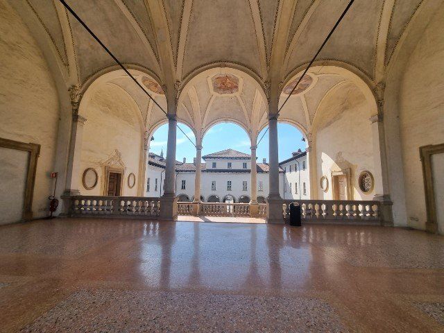 L'ingresso, senza accompagnatori, costa 3 euro. Nel cortile del palazzo, una signora, che esibisce il distintivo del Touring Club, il sodalizio che cura i momenti di apertura, ci spiega che potremo visitare il piano terra e solamente una parte del piano nobile. Dopo un lungo periodo di abbandono, l'enorme edificio, fu acquisito dal Comune una decina di anni addietro. Alcune parti non sono ancora state rese agibili.
