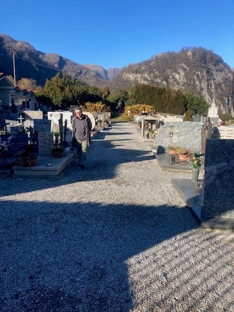 Piccolo, rapportato alla popolazione di un paese di montagna, il cimitero di Pasturo non è bello, affollato com'è da tombe fitte, buona parte delle quali rivestite da spesse lastre di marmo esotico, colorato. Qualche sepoltura esibisce anche sovrastrutture ridondanti. Giro un poco per i vialetti leggendo i cognomi che sono pochi, come lo sono le famiglie del luogo. "Pozzi" non è tra questi e non lo trovo. Mi arrendo alla svelta, chiedo a due signore. Ingenuo io a cercarla tra le altre. Infatti la si vede appena varcato l'ingresso, in fondo ad una breve prospettiva, occupa uno spazio maggiore di tutte, ha una statua in bronzo posata sopra lastre di pietra grigia e un prato intorno, come nessun'altra, qui, ha.