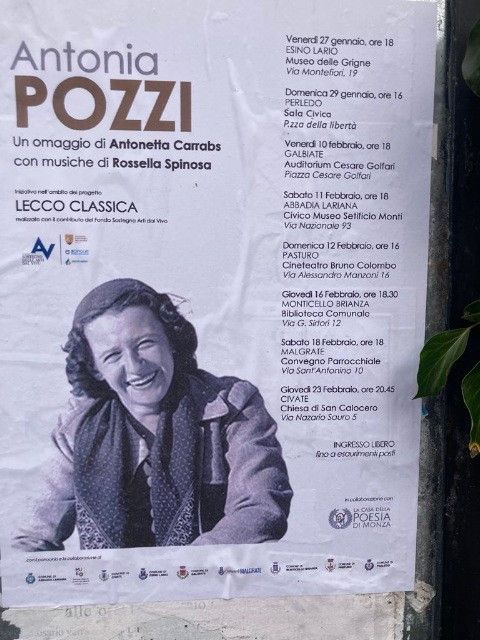 Il sagrato della chiesa di Perledo è vasto e proteso sul lago il quale oggi è un poco offuscato dalla bruma. L'anziano, vivace signore ha voglia di dire di sé, vuol sapere qualcosa di noi. E' il primo incontro da quando ci siamo mossi da Vezio. Là avevamo lasciata la macchina dove è previsto il pagamento della sosta solo a partire dal mese prossimo, quando dovrebbero arrivare tanti turisti. Faccio una fotografia al manifesto dove sono elencate diverse iniziative che riguardano Antonia Pozzi, poeta. Alcune sono già trascorse, ad almeno una delle altre mi piacerebbe partecipare.