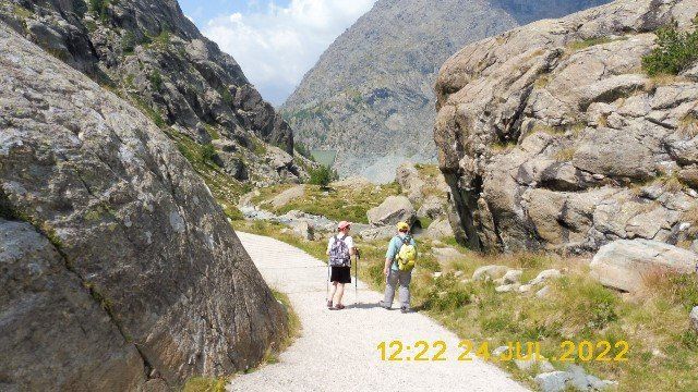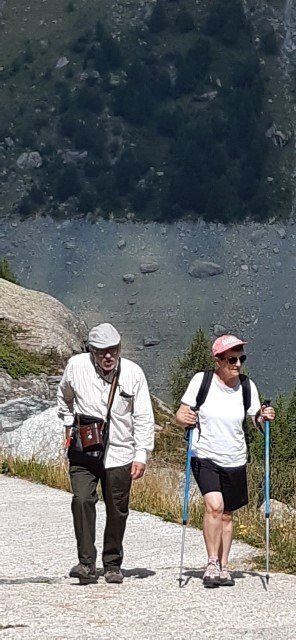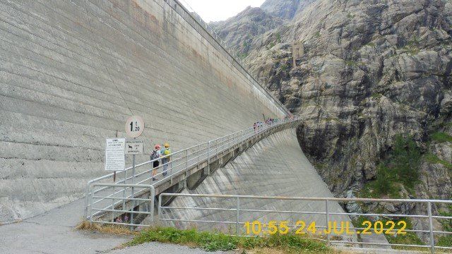 Per raggiungere il luogo che abbiamo scelto, io, Carmen e Lucilla, attraversiamo prima i grandi parcheggi situati alla base della diga superiore, occupati, in questo momento, da moltissime auto, poi risaliamo un passaggio aggrappato a sbalzo sul muraglione della diga medesima. Giunti al bordo dell'enorme costruzione si apre a noi la vista grandiosa del ghiacciaio di Fellaria che si scioglie nel lago di Gera il quale è piuttosto basso a giudicare dai segni lasciati dall'acqua sulle rive. Si scorge, cercando bene, anche il sentiero che va al Bignami e il rifugio stesso, là, alto su un poggio. Sono parecchi gli animosi che si cimentano sulle pareti chiodate che si affiancano al viottolo pianeggiante che percorriamo. C'è molta gente, mai folla: lo spazio è tanto. L'alpe Poschiavina è fatta di poche baitelle curatissime, l'acqua della fontanella che è nel mezzo è buona e freschissima come ci si aspetta. Sia Carmen che Lucilla lamentano di avere camminato troppo a lungo il giorno prima. Qualche dolore ai muscoli affiora qua e là. Ieri, con la variazione effettuata al ritorno dal Cristina si è, evidentemente, esagerato.