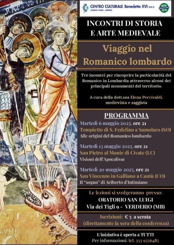 Ieri, martedì 12 maggio 2025, presso l'oratorio di Verderio, ho partecipato alla conferenza tenuta da Elena Percivaldi su "San Pietro al Monte. Visioni dell'Apocalisse". Sono stato presente anche all'incontro precedente, di martedì 6 maggio 2025, che riguardava "Il tempietto di san Fedelino a Samòlaco. Alle origini del romanico Lombardo".