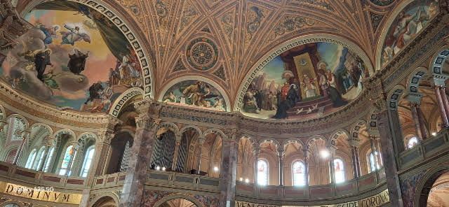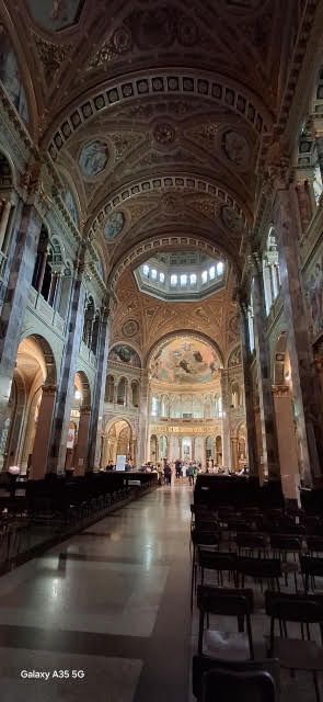 Abbiamo il tempo per visitare la chiesa. All' interno ci sorprendono gli ampi spazi, la complessità architettonica, le decorazioni elaborate, la luminosità. Una dozzina di confessionali, costruiti alla maniera imposta da Carlo Borromeo, sono allineati sull'arco disegnato dalla base della cupola principale. Entriamo quando si sono concluse da poco le prime comunioni. I ragazzi interessati portano un'abito uguale, bianco, lungo e un crocifisso al collo. E' un evento familiare sicché i gruppi parentali si fanno fotografare davanti all'altare. Tranne un ragazzo nero con i suoi, in netto contrasto con i frequentatori del mercato, qui sembrano esserci solo persone originarie del posto. C'è movimento e una confusione bella. Pensiamo che adesso si recheranno tutti a pranzo, a continuare la festa, in qualche locale scelto appositamente. Per fortuna non troviamo nessuno di loro, come temevamo, dove andiamo noi, che pure è nella piazzetta alle spalle della basilica. "Il Circolino" non si presta alle grosse compagnie e ai pranzi importanti. E' una trattoria, dall'aria antica, ricavata da una casa d'abitazione. Ci troviamo bene e ce la caviamo con la spesa di 20 euro ciascuno. Quando usciamo, quasi alle 14, troviamo una sorpresa. Il mercato è sparito. Le strade, ora vuote, sono già state pulite. Sembra di trovarsi in un'altra città.