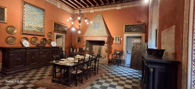 La visita guidata al castello, proposta dall'associazione Lombardia Segreta, prenotata da tempo, costa 13 euro. A chi entra viene consegnato un adesivo a mo' di distintivo. Il cortile è grande, il castello immenso. Siamo in parecchi sicché formiamo due gruppi di circa trenta persone che seguiranno l'uno il percorso diritto, l'altro quello a rovescio. Tanto è lo stesso ci dice la guida: ci incontreremo a metà. Iniziata, puntualmente alle 15, la visita dura circa un'ora e mezza. Attraversiamo forse una ventina di stanze, dipinte, arredate, munite di oggetti notevoli e rari reperti. Sono almeno una parte di quelle, che, dopo essere state abitate, sono divenute museo. La guida, una signora non banale, piuttosto preparata e interessata alla materia che tratta, ci narra di alcune vicende dei proprietari che si sono succeduti. Siamo all'interno di un ampio fortilizio, collocato sulle sponde del Lambro a difesa dei confini del ducato milanese, che nel tempo è stato molto ampliato e modificato fino ad addivenire una sorta di palazzo signorile inserito in una fortezza. Del resto qui non viene mostrata che una frazione di ciò che hanno realizzato molte generazioni di signori che si sono succedute. All'inizio devono essere stati feudatari, poi capitani di ventura, gente dedita alla guerra prima per sé e poi, se del caso, per conto di altri. Poi avranno sfruttato a lungo chi lavorava le loro terre nel contado d'intorno. Da dove sarebbe potuta provenire, sennò, tutta la ricchezza esibita con questo formidabile edificio del quale, dell'interno, andiamo esplorando, superficialmente, una minuscola porzione? L'albero genealogico della famiglia Morando Bolognini, dipinto su una parete piuttosto alta, è forse più complesso e ramificato di quello di Jesse cui lavorarono Meda e Arcimboldo nel duomo di Monza. La persona che ci accompagna ci legge, a voce alta, quanto scrisse Giacomo Casanova di questo castello, quando vi fu ospitato e vi dormì male. Divertente. La stessa ci mostra alcuni intriganti accessi a vie di fuga un tempo tenute nascoste ma ora conosciute. Chissà se mai furono utilizzate e chissà quante saranno le altre mai scoperte. Da un cassetto della libreria antica tira fuori, tra altri che vi sono riposti, un taccuino le cui pagine sono riempite con una chiara, ordinata, scrittura. E' il diario di un viaggiatore che nell'Ottocento visitò terre lontane. Ora si sta provvedendo alla trascrizione, con sistemi telematici, dei documenti di questa natura presenti nella collezione del castello. Peccato non aver preso nota del nome dell'autore, nonostante anch'io prenda appunti con il lapis.